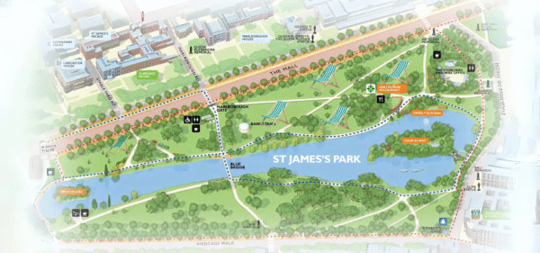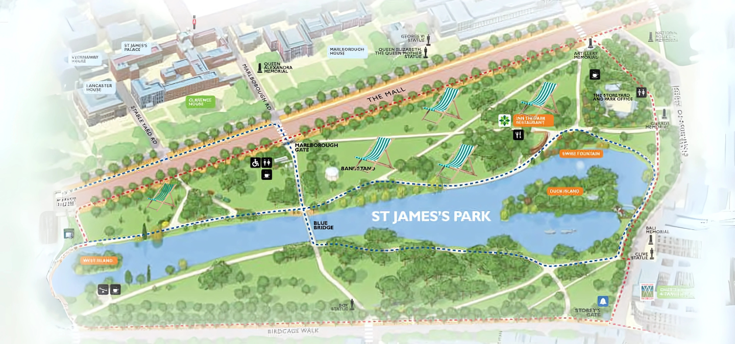 St James’s Park includes The Mall and Horse Guards Parade, and is surrounded by landmarks such as Buckingham Palace, Clarence House and Whitehall.